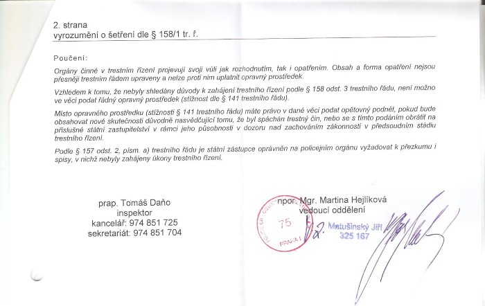Vaše výše zmíněné „Vyrozumění“ považuji za výsměch povinnostem, jež máte plnit a za které jste placeni, stejně jako výsměch platnému trestnímu řádu a trestnímu zákoníku.