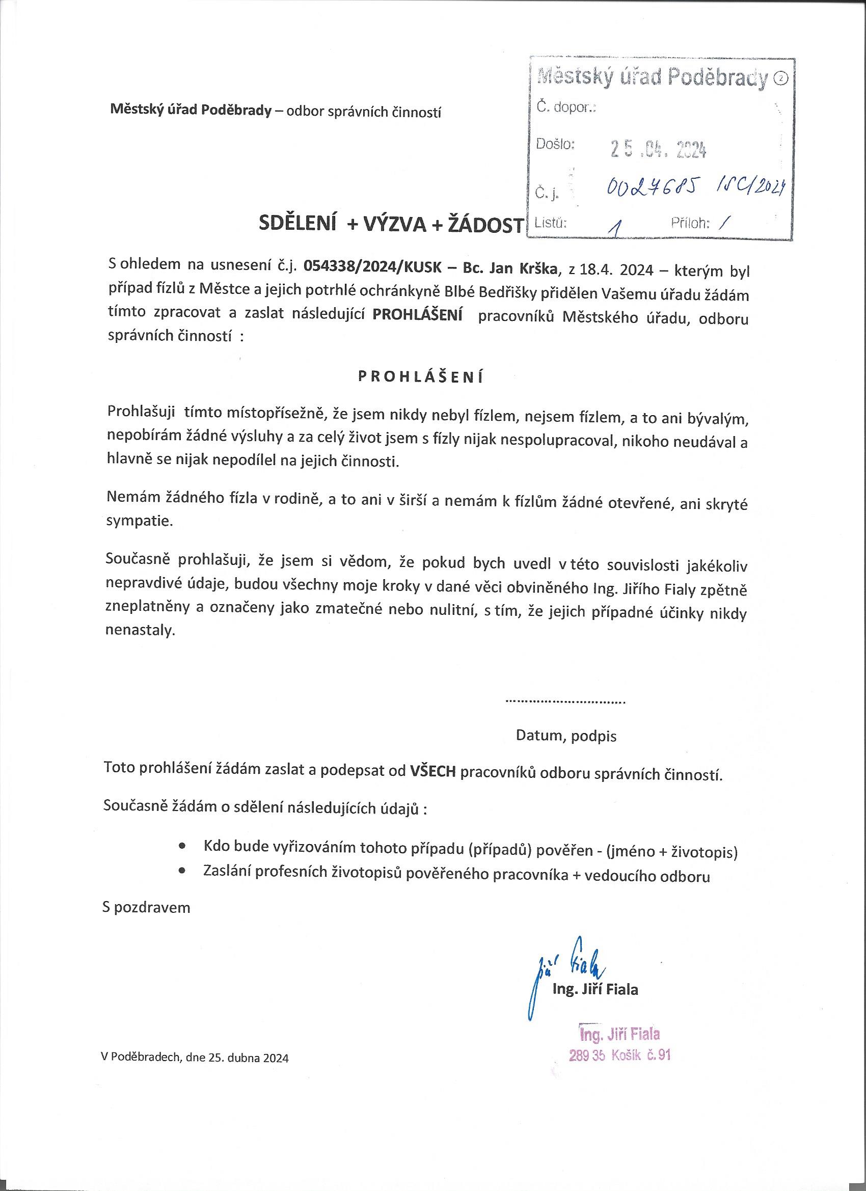 No, a protože poděbradský městský úřad nemá pověst o nic lepší než ten nymburský, tedy - přesně, jak řečeno - coby úložiště nepotřebných a neupotřebitelných bývalých fízlů, kteří jsou na tom tak zle, že k výsluhám si museli přibrat ještě vedlejšák na městském úřadě - tak jsem se rozhodl s tím "něco dělat" - a zjistit si předem, "s kým mám tu (pochybnou) čest".
