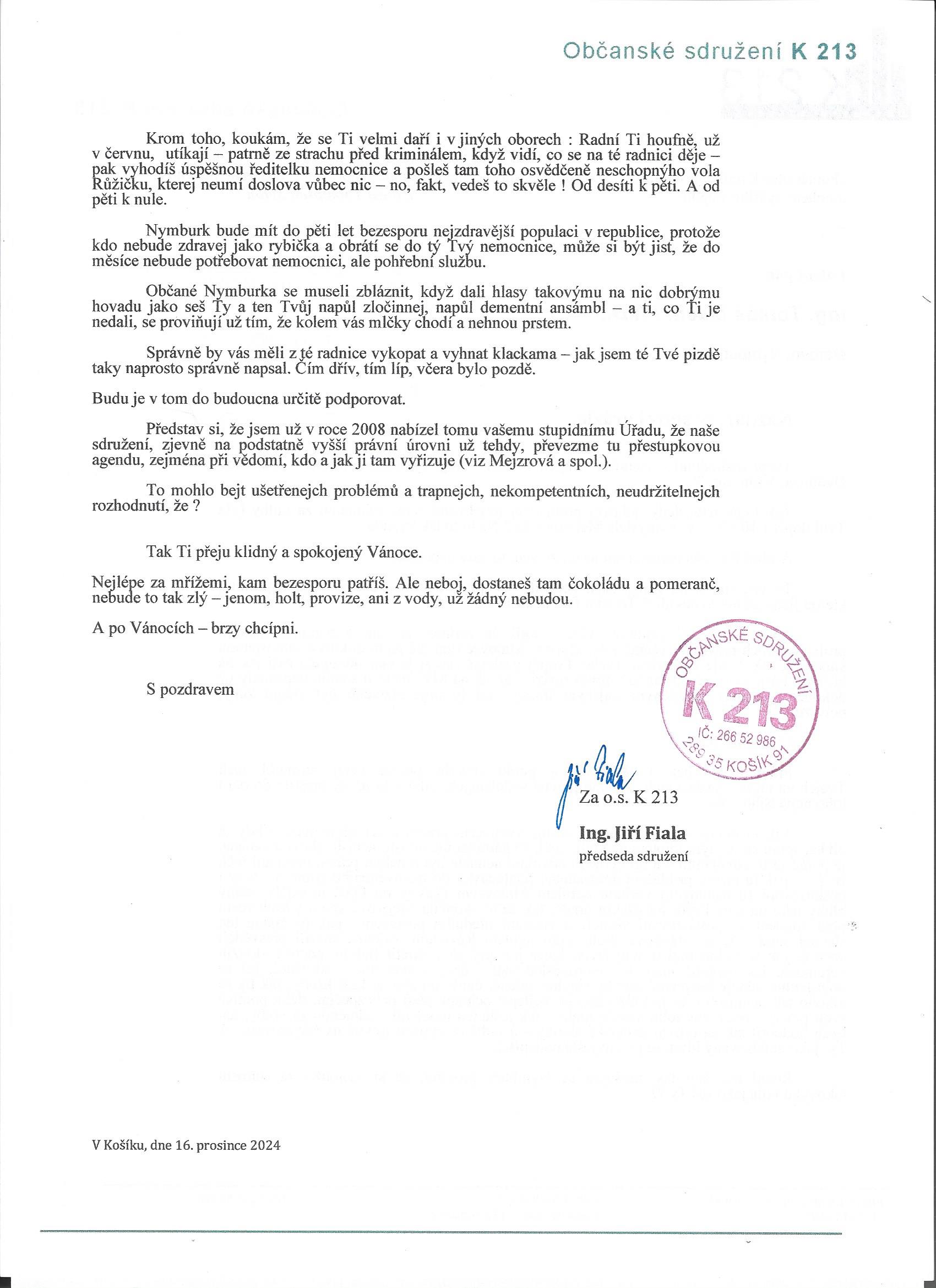 Řekl bych, že upřímnější dopis letos ještě nedostal. A nejen na Vánoce. A ani nedostane.